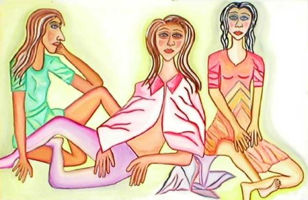 The blonde has a sharp, angular face with wheeling, gleeful eyes that seem to take in half the cafe whenever she looks up from her companions. She�s wearing a sea-green top with tight checkered pants and high black heels. The Brunette has curly hair and never stops smiling with her red lips that have that weird characteristic where they look a little like they�re frowning through her smile; her eyes look tired and she�s wearing an especially low-cut top. The redhead is wearing funky, rectangular glasses and lipstick almost as red as the brunette�s, she looks somehow very young, even with the glasses, has a clear, open face and loves to make little ironic scowls.