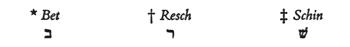 Call up before your souls this picture which I have just tried to paint for you, this image of the living weaving of spirit into a kind of matter; imagine too the inner soul-force which causes it to happen; concentrate for a moment on this to the exclusion of all else, and you will then have something approximating what lived in an ancient Hebrew sage when the sounds B'reschit penetrated his soul. Bet [Figure 2] the first letter, called forth the weaving of the habitation in substance; Resch , the second sound, summoned up the countenances of the spiritual Beings who moved within this dwelling, and Schin, the third sound, the stinging force which worked its way out from within to manifestation.